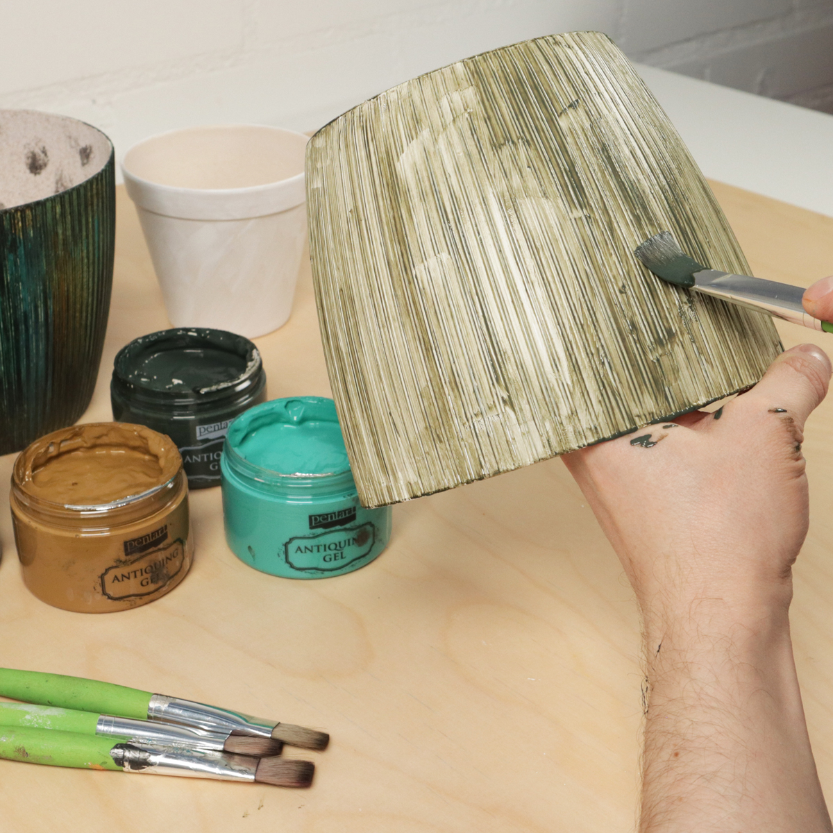 Huomaa! Kun päällystät kiiltäviä pintoja, kuten muovia, lasia tai metallia, pohjusta pinta ensin tartuntapohjusteella (esim. Bonding Primer), jotta Antiquing Gel tarttuisi paremmin ja näin kestäisi aikaa.
