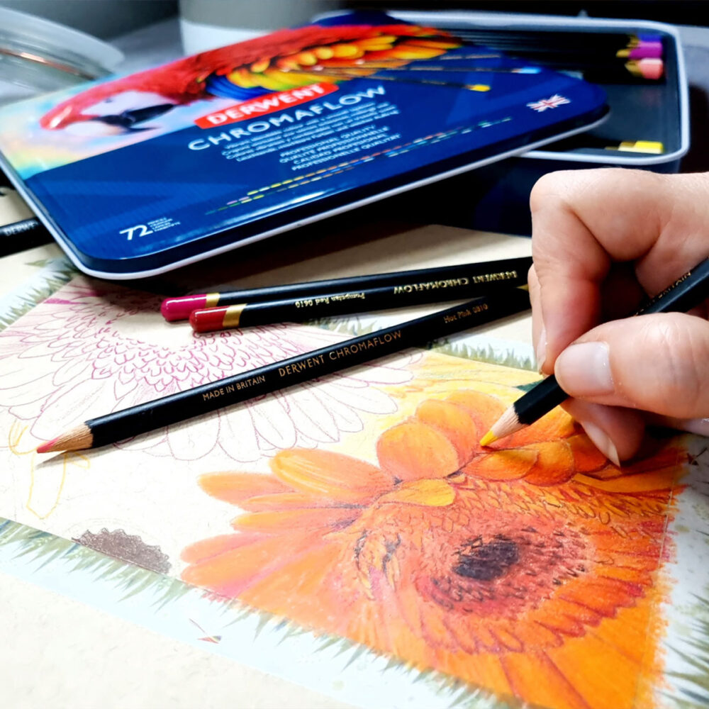 Derwentin taiteilijalaatuisilla Chromaflow-värikynillä luot piirustuksiisi hätkähdyttävän voimakkaita ja elinvoimaisia värisävyjä sekä tasaisen samettisen lopputuloksen! Runsaspigmenttisen, vahapohjaisen lyijyn sekä kermaisen, painetta kestävän ytimen ansiosta värejä on helppo kerrostaa, varjostaa, häivyttää ja sekoittaa keskenään.